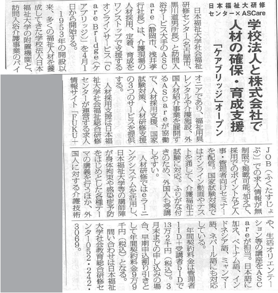 日本福祉大学様と弊社の共同サービス「Care Bridge(ケアブリッジ)」に関する記事を掲載いただきました。